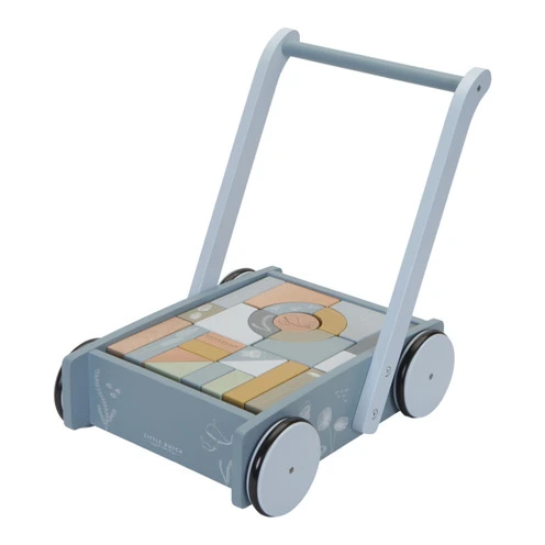 – Le chariot est doté de roues en bois et rempli de blocs colorés.