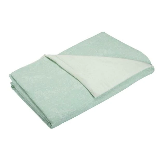 – La couverture réversible et rembourrée avec sa face en velours vert sauge et sa face aux motifs all-over.