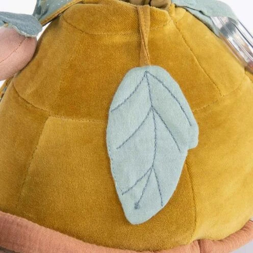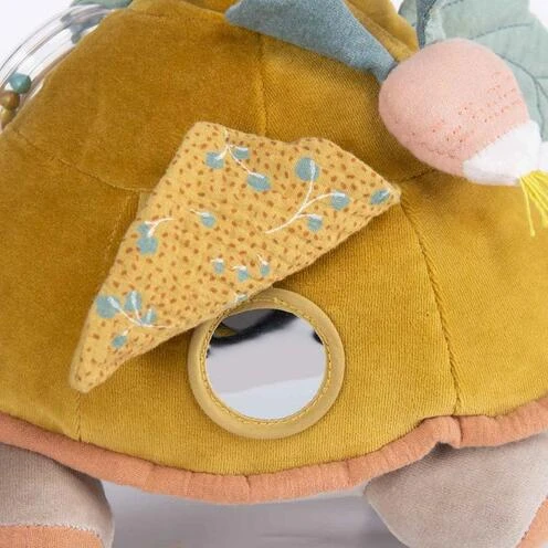 – La tortue d’activités en lange et velours accompagnera les petits dans l’exploration, avec grelots, anneau à billes colorées, papier crissant, miroir… qu’elle cache dans sa carapace tout douce.