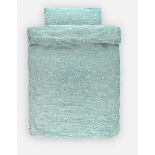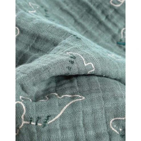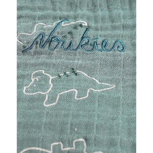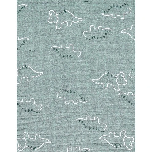 Retrouvez la housse de couette verte en mousseline de coton BIO de la collection Mix & Match imprimée dinosaures, elle peut aussi être utilisée comme couverture et reste toujours bien en place sous le matelas.