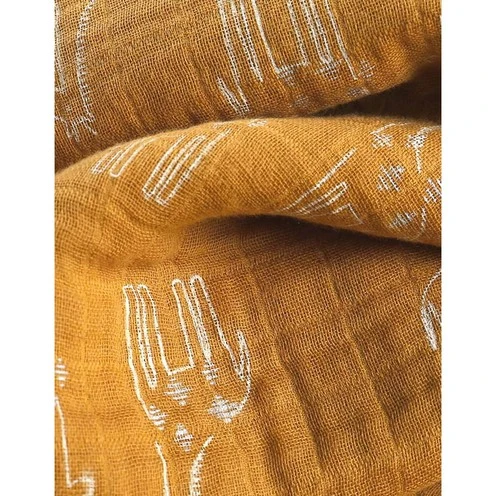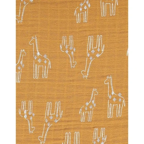 Retrouvez la housse de couette ocre en mousseline de coton BIO de la collection Mix & Match imprimée girafes, elle peut aussi être utilisée comme couverture et reste toujours bien en place sous le matelas.