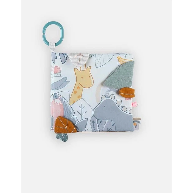 Ce livre en popeline et mousseline de coton BIO est un livre illustrant l’histoire de nos petits personnages Tiga, Stegi & Ops.