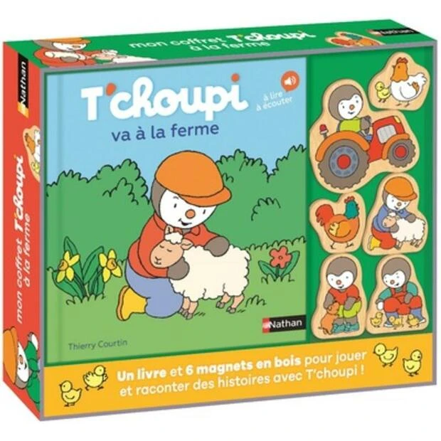 Un coffret pour jouer avec T’choupi à se raconter des histoires, avec un livre + 6 magnets en bois de la ferme.