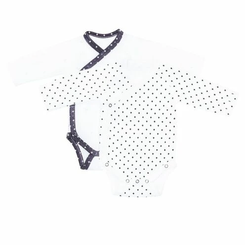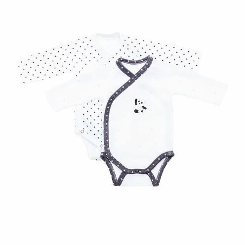 – Le lot se compose de deux bodies mixtes manches longues aux couleurs contrastées: un body blanc avec colletage contrasté gris foncé et un body en imprimé all-over graphique noir et blanc.