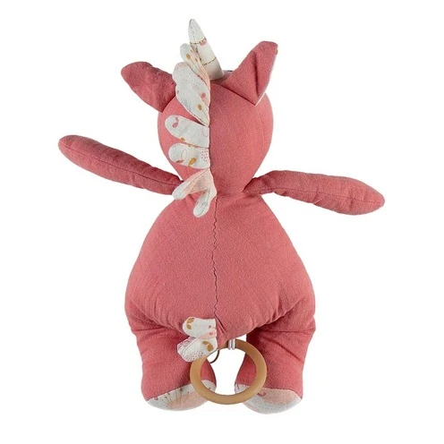 Peluche musicale Lina en mousseline de coton rose foncé, détails des oreilles et pattes fleuries, de la collection Lina & Joy