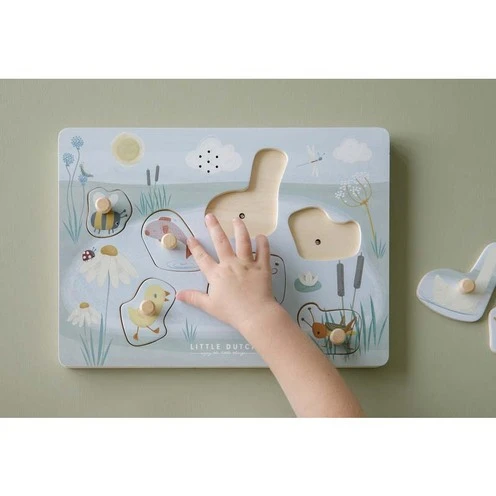 Faites découvrir l’oie et ses amis à votre enfant, qui pourra reconnaître leur forme et leur cri grâce à ce joli puzzle sonore.