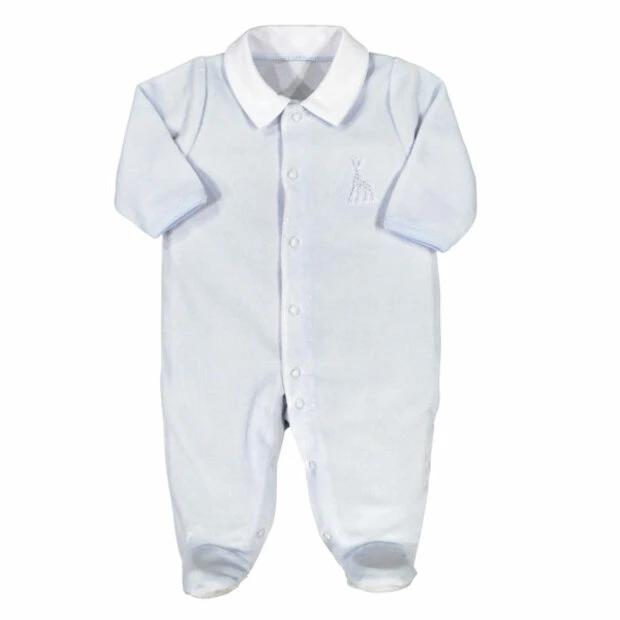 Dors bien en coton, bleu tendre. Une ouverture à pressions sur le devant est prévue pour faciliter le change.