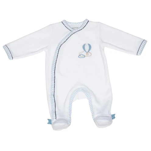 A la naissance, il est essentiel de maintenir bébé au chaud. Les pyjamas Sauthon en bouclette velours et ouverture Y préservent le confort et la chaleur des tout-petits. Décliné en blanc neige avec colletage et bouts de manches en jersey imprimé bleu-ciel, le pyjama naissance s’associera parfaitement aux bodies et à la gigoteuse Lazare. Délicate broderie de Lazare dans son avion sur la poitrine.