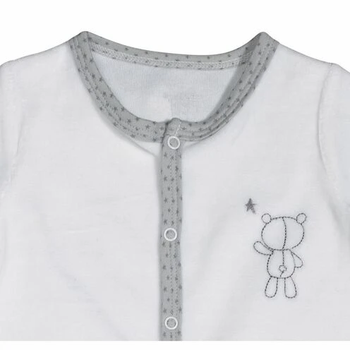 Décliné en blanc neige , il s’associera parfaitement aux bodies et à la gigoteuse Céleste: Un pyjama velours blanc associé à un colletage gris foncé en all-over étoilés.