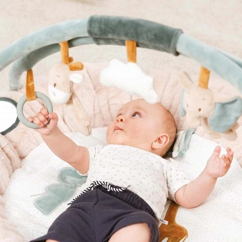 Ce tapis d’éveil avec ses éléments suspendus est particulièrement doux et moelleux, pour que vos enfants se sentent bien en jouant.