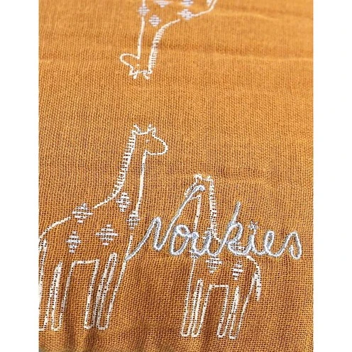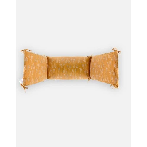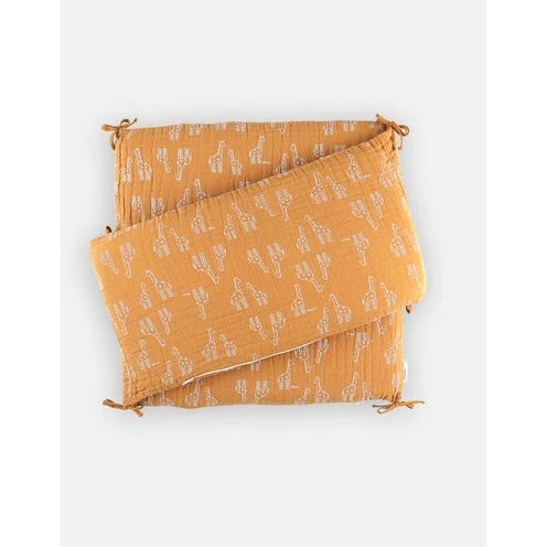 – La housse ocre est en mousseline de coton bio avec un joli motif girafes.